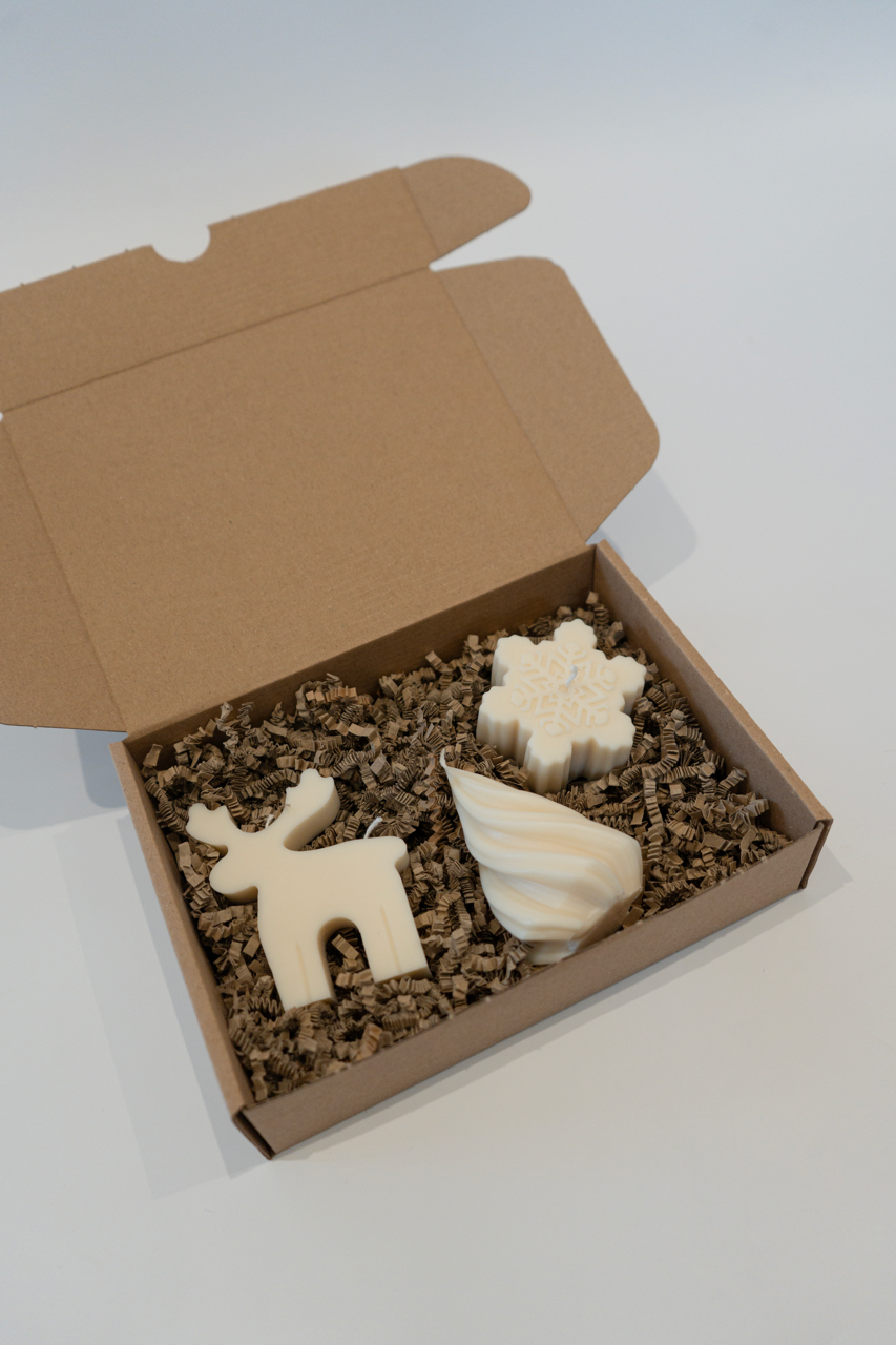Darilni paket vsebuje snežinko, malo smrečico in jelena.